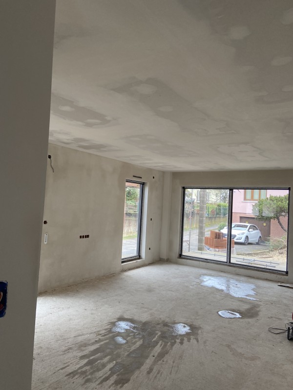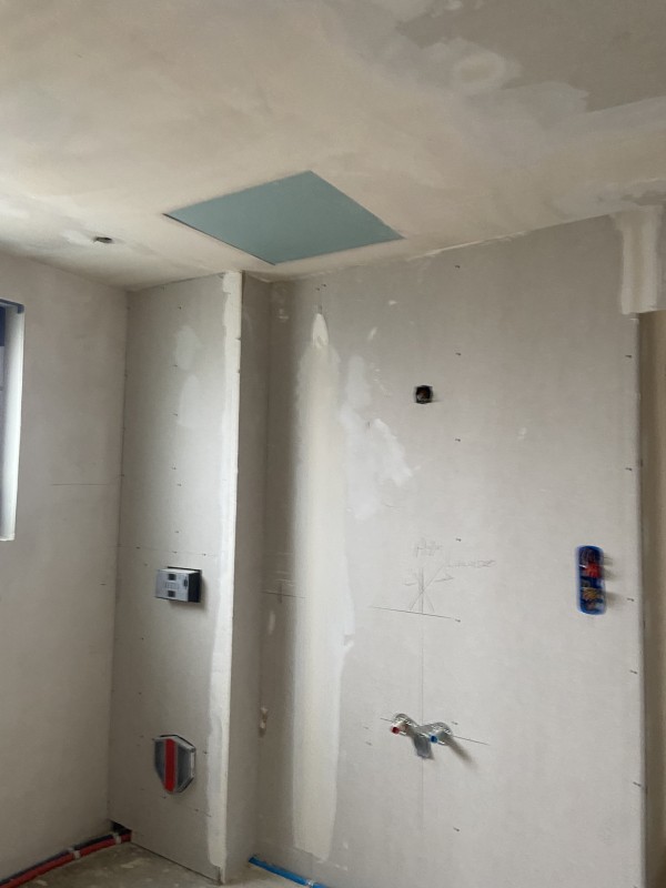 Nous avons tout d’abord effectué la pause d’enduit au plâtre projeter mécaniquement, puis soigneusement lisser pour obtenir des murs parfaitement uniforme et avoir un support prêt à peindre.