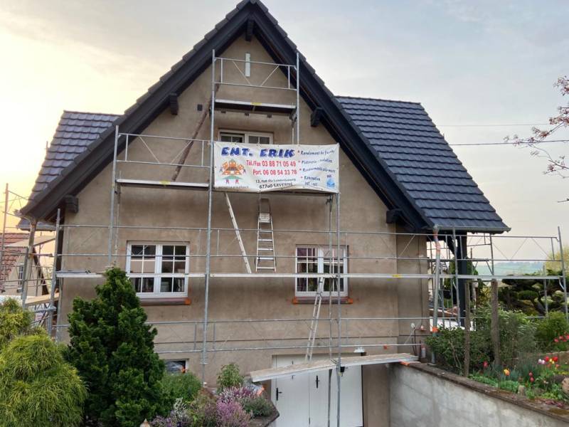 Nous avons effectué la pose d'un filet et d'une colle sur l'ensemble des façades de cette maison située à Haegen proche de Saverne. En effet, la façade du bâtiment présentait de nombreuses microfissures. Nous avons également appliqué un revêtement épais plastique aspect taloché pour la finition avec une teinte choisie par le client, afin de maintenir l'aspect esthétique de la maison.